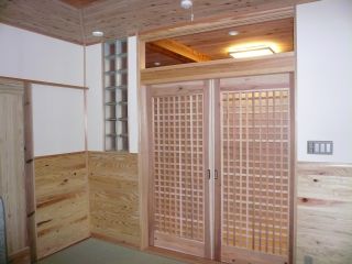 ど全て杉の建具を使いました。又、各部屋の床壁天井も杉板を使用していす。 |
